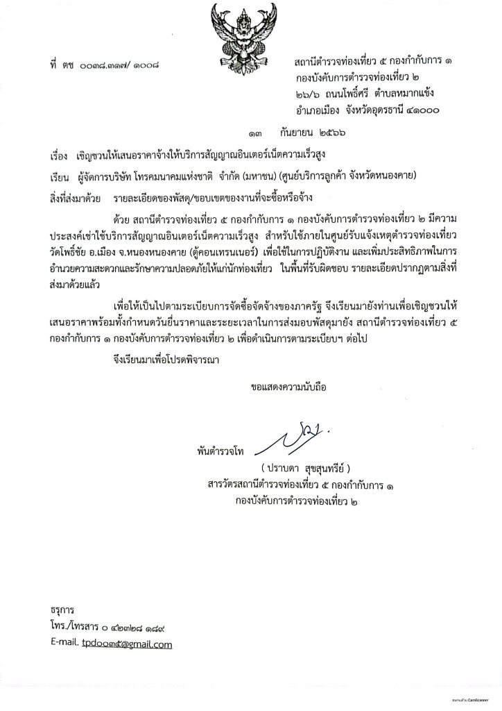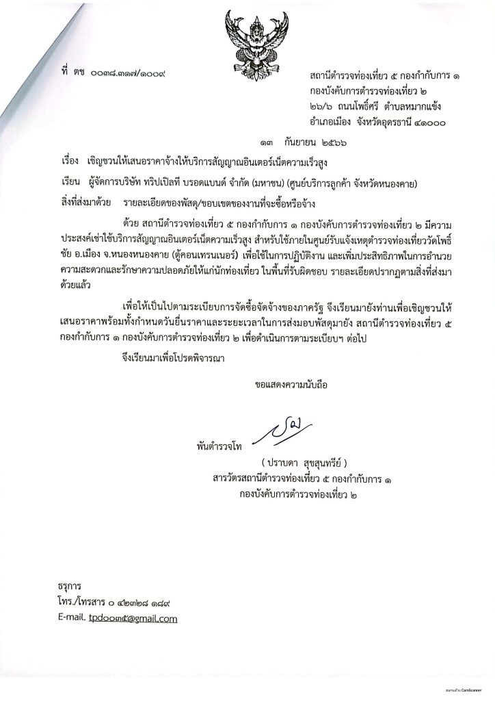 เชิญชวนให้เสนอราคาจ้างให้บริการอินเตอร์เน็ตความเร็วสูง จุดบริการนักท่องเที่ยววัดโพธิ์ชัย อ.เมือง จ.หนองคาย