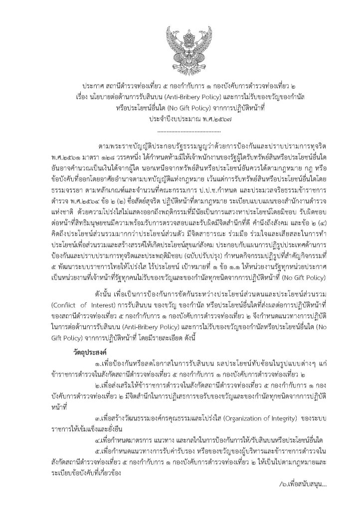 ประกาศ สถานีตำรวจท่องเที่ยว 5 กองกำกับการ 1 กองบังคับการตำรวจท่องเที่ยว 2 เรื่อง นโยบายต่อต้านการรับสินบน (Anti-ribery Policy) และการไม่รับของขวัญของกำนัลหรือประโยชน์อื่นใด (No Girt Policy) จากการปฏิบัติหน้าที่ประจำปีงบประมาณ พ.ศ.2567